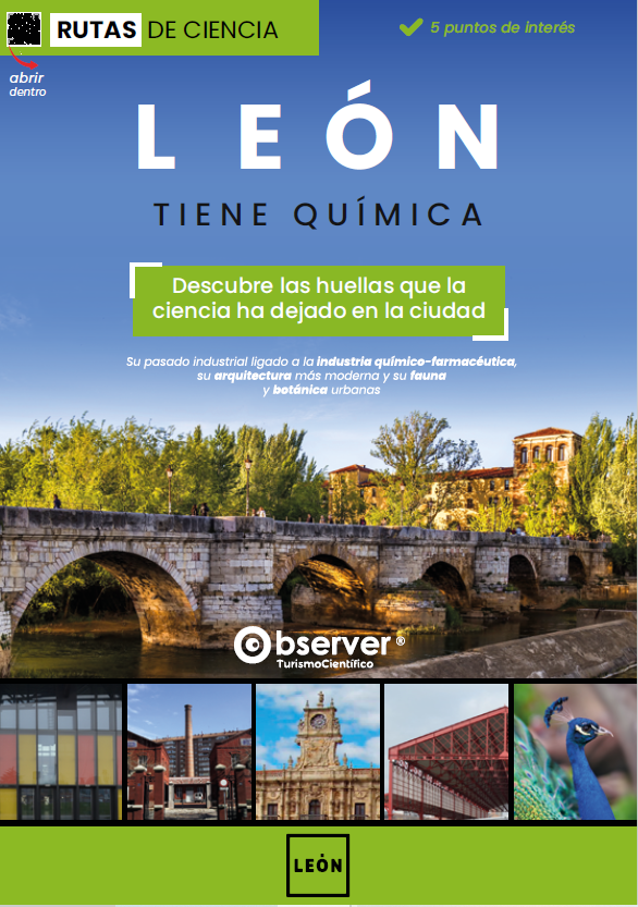 Y León tiene química es el nombre de la ruta de ciencia que el Ayuntamiento de León ha puesto en marcha con nuestra colaboración. Se trata de un recorrido por las huellas urbanas que la ciencia ha dejado en la ciudad. Está compuesto por una selección de cinco lugares emblemáticos, que nunca volverás a ver igual, y en los que afloran su historia industrial ligada a la química, su arquitectura y arqueología, y su botánica y fauna urbanas como muestras representativas del conocimiento científico antiguo y actual.